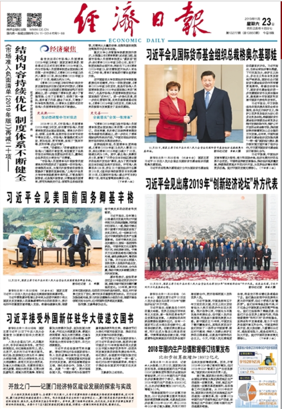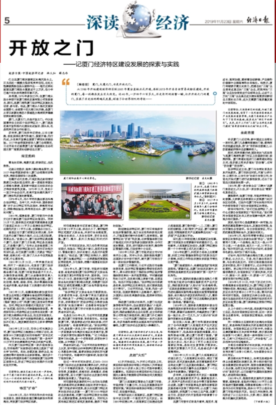 经济日报11月23日头版进行导读,5版、6版以连续两个整版的《深读经济》特稿形式,刊登了《开放之门——记厦门经济特区建设发展的探索与实践》一文。文章用一万两千多字的宏大篇幅,通过大量生动的故事和鲜活的案例,详细阐述了新中国成立70年来厦门经济社会发展取得的突出成就,展示了十八大以来尤其是今年以来厦门发展的新气象新变化新成就,盛赞厦门是新中国发展成就的缩影。