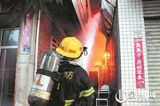 事发后,泉州消防支队调集了晋江三个消防中队、南安水头消防中队及当地的专职消防队一同参与扑救。消防官兵分成多组,架设高压水枪阵地,从不同方向对大火进行压制。同时,火场前后方和右侧都是建筑物,消防员全力压制大火进行阻燃,以防蔓延,威胁毗邻建筑物的财产安全。