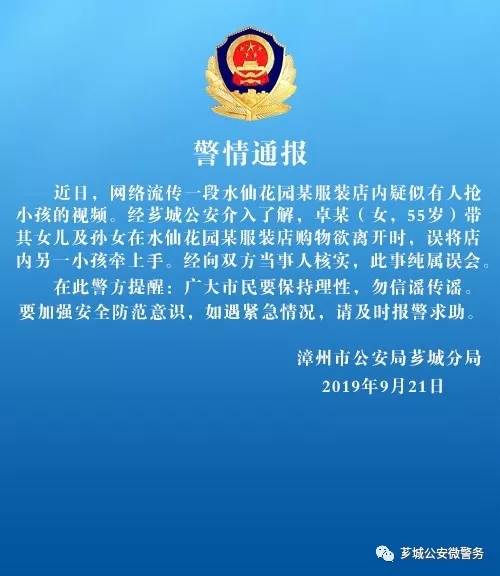 芗城公安发布警情通报 辟谣水仙花园附近有人“抢小孩”事件
