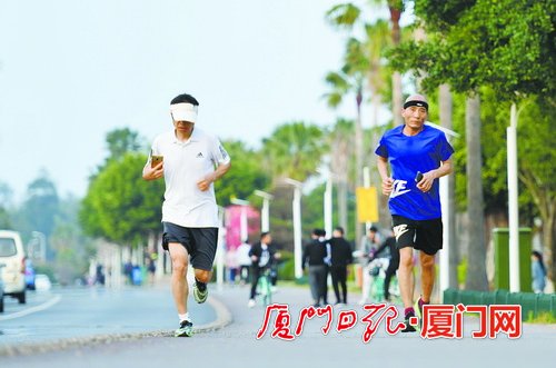 近日,在厦大白城至香山游艇会的环岛路沿线,记者路遇不少头戴空顶帽、脚蹬跑步鞋的市民正挥汗如雨地奔跑,还不时为路遇的同伴加油打气。