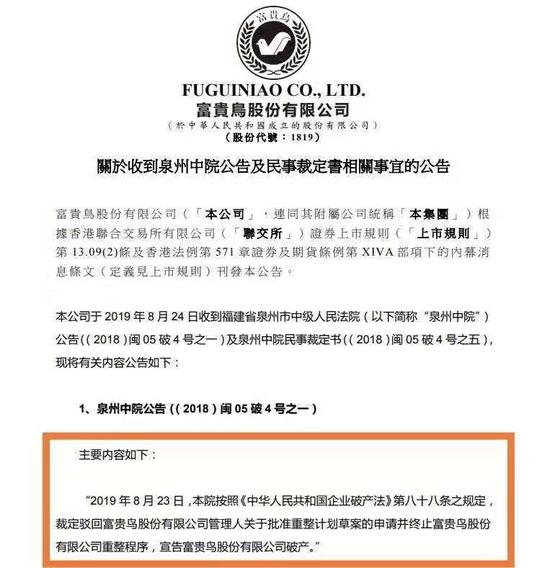 2016年9月1日,富贵鸟宣布停牌。作为债权受托管理人,2018年7月26日国泰证券向泉州市中级人民法院申请富贵鸟重整。但是今年5月9日富贵鸟提出的重整计划草案未获债权人通过。8月26日随着泉州中院裁定一出,富贵鸟宣告正式破产