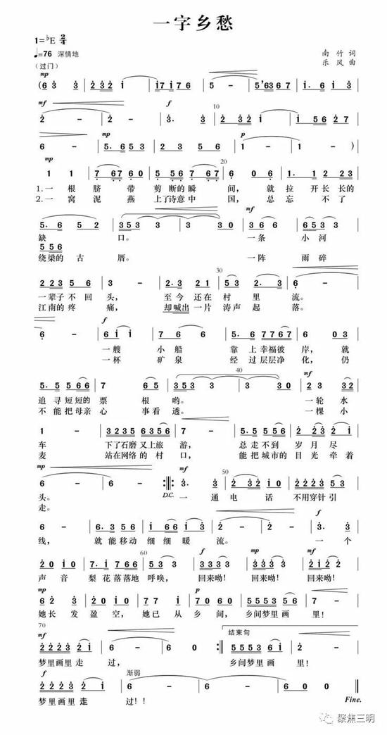 笔者来自福建的一个小山村,是尤溪籍本土诗人,在穿越农村到城里的漫长岁月之间,睹物思情创作了这首《一字乡愁》。歌词以十个“”把故乡的古厝、泥燕、小河、小船、水车、矿泉、小麦等用电影画面的形式展现出来。意在画中有声,声中有画,描绘出家乡古老的愁韵,希望是一首永远读不完的小诗。歌词以“她长发盈空 已从乡间的梦里画里走过”结句,意在一幕幕情景具像的归结和升华,又期冀古老情愫与现代情思“欲走还回”的交融,总之蕴藏着心头深情的留恋和展望吧!