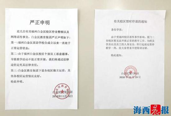 另一张告示《严正申明》表示,福州白金汉校区系个别员工恶意滋事,导致教学活动不能正常开展;白金汉教育集团旗下各校区运营情况良好。