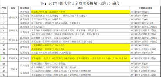 据介绍,2017年10月1日,全省高速公路共发生交通拥堵(堵路超3公里或时长超60分钟)次数高达118次,占国庆7天拥堵总数53%,其中10次以上路段依次为:三明30次,漳州29次,福州20次,宁德15次,泉州12次,龙岩10次。