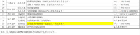 2017年10月1日,除莆田外,其余8个设区市8条高速公路19处路段均出现不同程度拥堵状况,另有7处普通公路国省道路段受高速影响,产生牵连拥堵。分析原因主要受5个因素影响:(一)旅游流量井喷。如平潭、东山、古田、冠豸山、南靖等地景点吸引大批游客,导致渔平高速江镜特大桥,沈海高速漳州云霄、漳浦段,厦蓉高速龙岩上杭下道湖枢纽至龙岩西路段,309国道漳州南靖书洋等路段拥堵。(二)多线并道超负。如泉南高速泉州永春龙阁岭隧道路段,与厦沙、莆永高速多条高速并线,车流汇聚最为拥堵。沈海高速宁德吴楼(福安下白石)路段也属于多条高速共线路段。(三)高地衔接不畅。如福州绕城高速贵新隧道,机场高速马尾段与江滨东大道交界处,以及泉州308省泉州安溪道魁斗镇和307省道剑斗镇、金淘镇路段,319国道龙岩新罗龙门路段,因高速拥堵流量溢出而拥堵。(四)隧道枢纽瓶颈。如京台高速福州闽侯荆溪天龙山隧道、白沙镇半山隧道,福银高速福州闽侯竹岐、鸿尾隧道群,沈海高速厦门海沧枢纽天成山隧道,沙厦高速泉州洋中枢纽至厦门龙门隧道等路段。(五)施工布控影响。如长深高速三明沙县凤岗路段(余厝隧道路段南平往三明方向),当时因沙厦高速际口枢纽施工限制通行,车流猛增导致拥堵。
