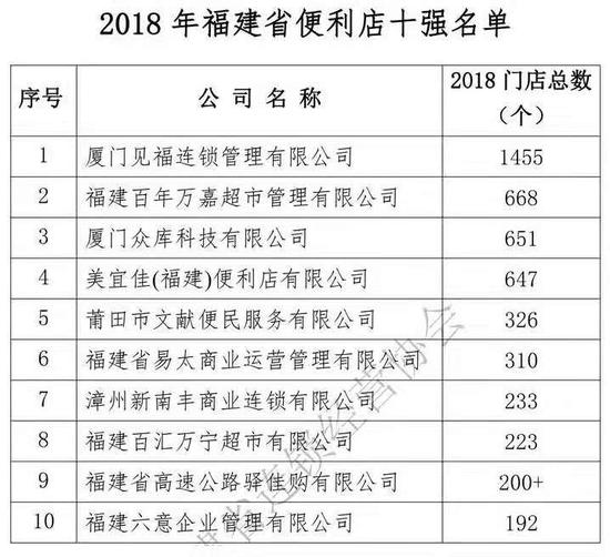 近日,福建省连锁经营协会等发布了“2018年福建省便利店十强”,我市三家企业入围,分别是见福、众库科技和美宜佳(福建)便利店。其中见福以1488个门店总数再次位居第一,众库科技以651家位居第三,美宜佳(福建)便利店以647家位居第四。