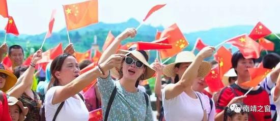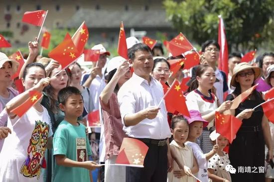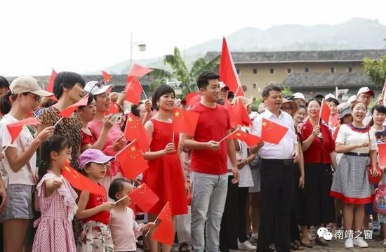 航拍镜头俯瞰下,人群紧紧围绕,大红旗、小红旗在风中飘扬,大家引吭高歌。对祖国的美好的祝愿、对南靖未来的期许,久久飘荡在活动现场的上空。
