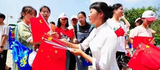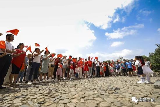 当天,在南靖土楼云水谣景区怀远楼前,游客络绎不绝。突然传来的甜美童声,一时间吸引了所有人的注意,参与快闪活动的主唱演员手拿红旗从四面八方向广场中心走来。