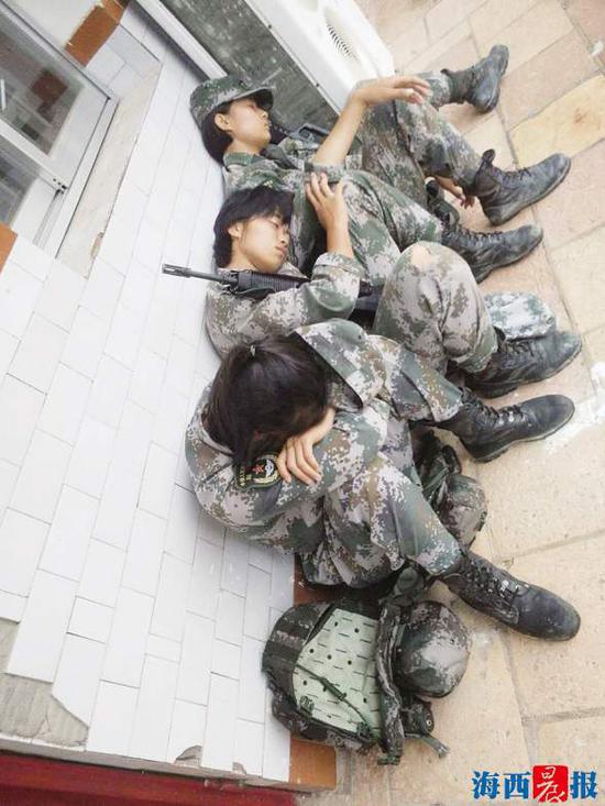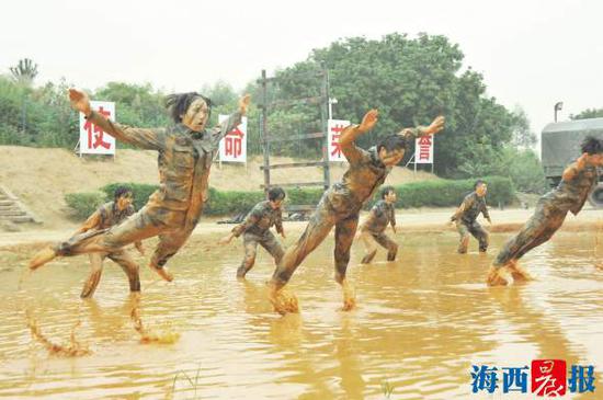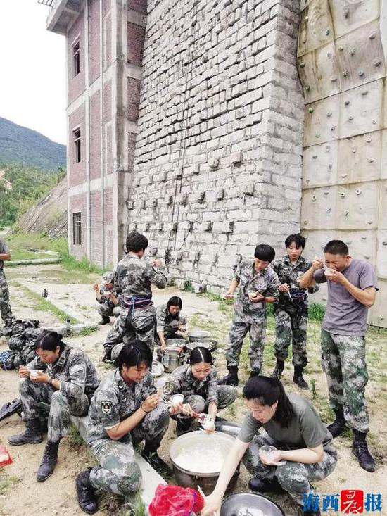 从15米高墙跑下来,帅气的动作有没有大片的即视感? 飞跃火障,果断利索,一展“女汉子”风采。 再牢的作战靴,也经受不住如此高强度的磨练。 廖华清(左)与队友在比武前互相鼓励。 比武期间,吃饭只能在训练场匆匆解决。 泥潭倒功,丝毫不逊色于男兵。 比武间隙,她们在训练场边靠墙休息。 伞降实跳,800米高空一跃而下。