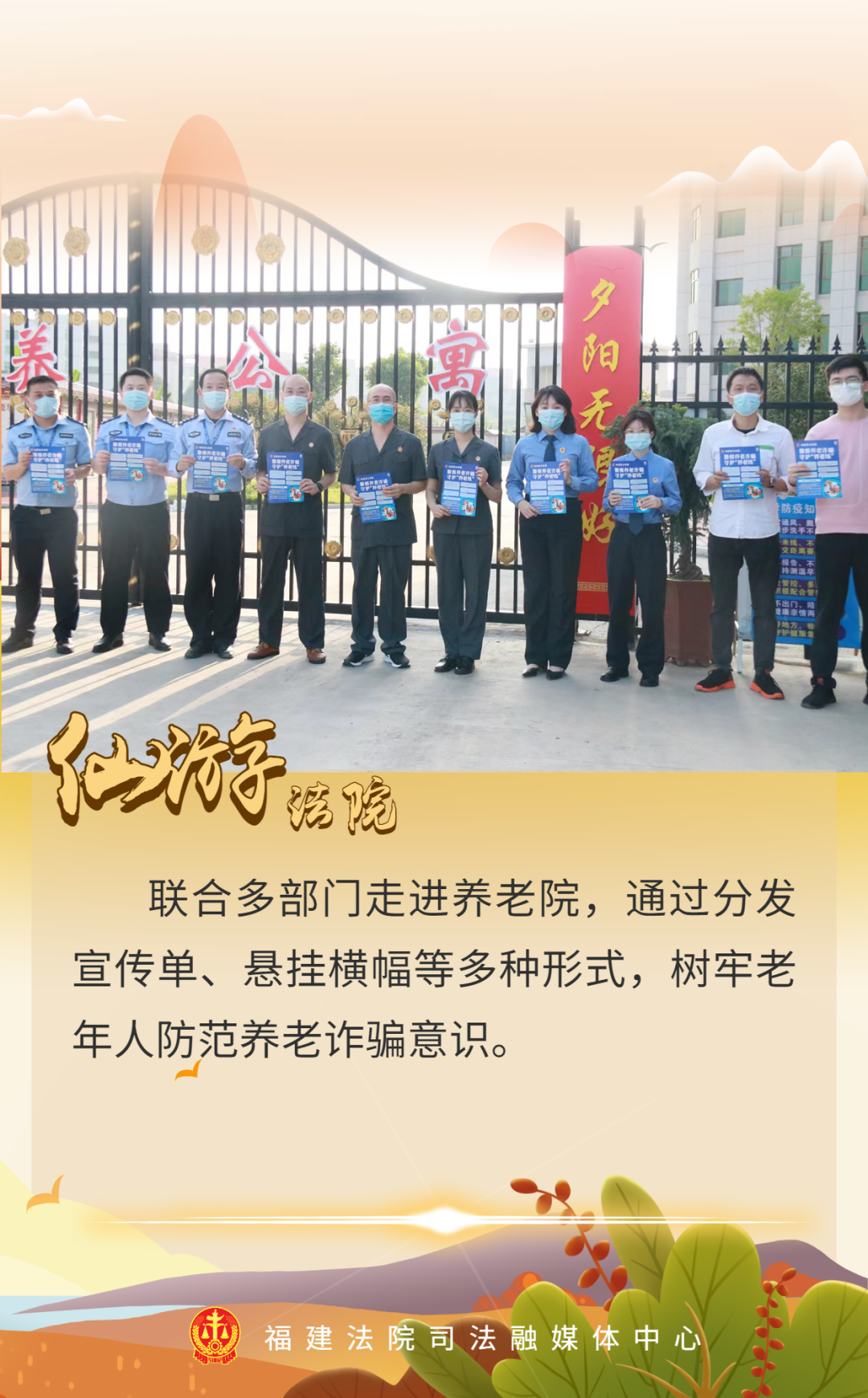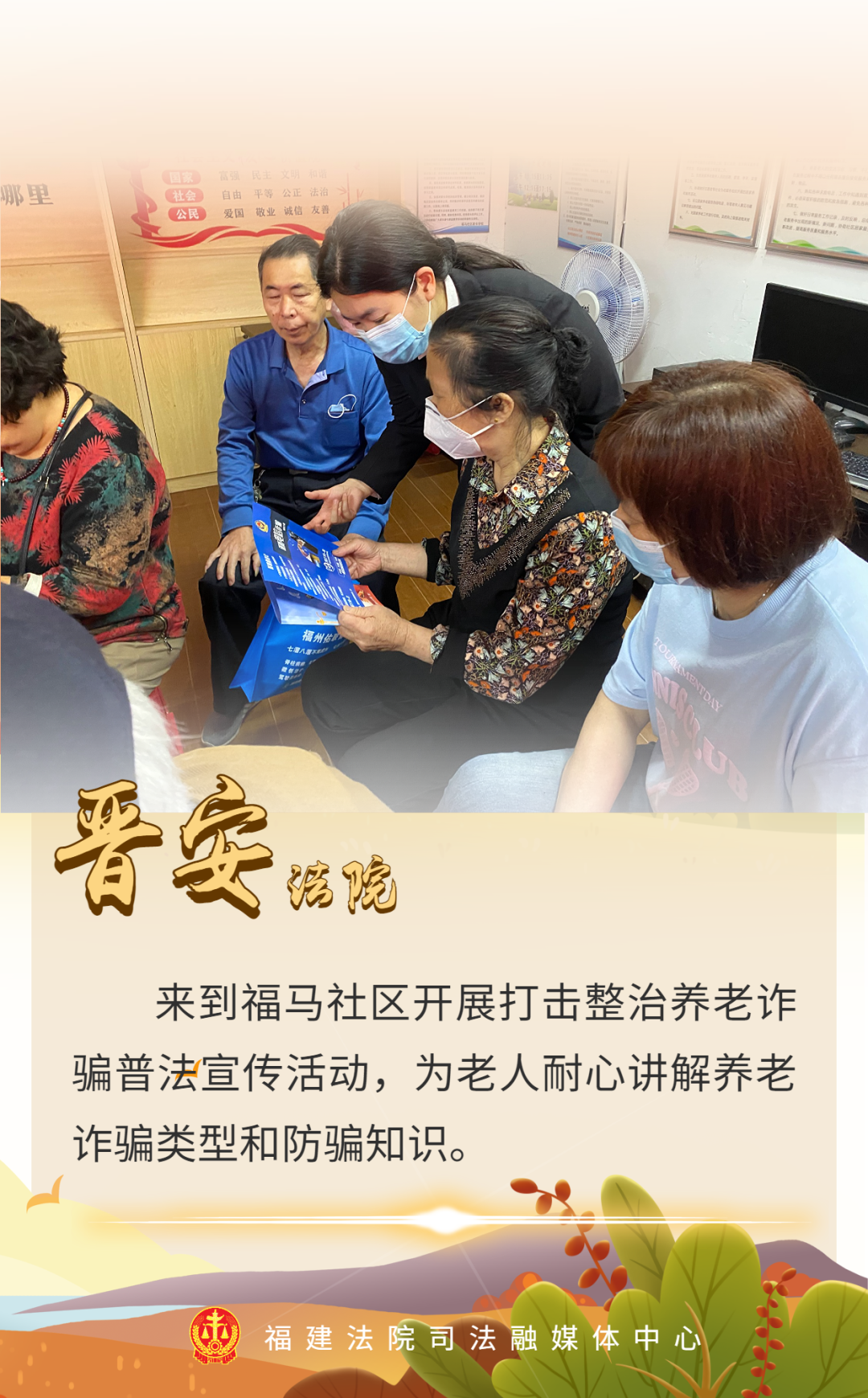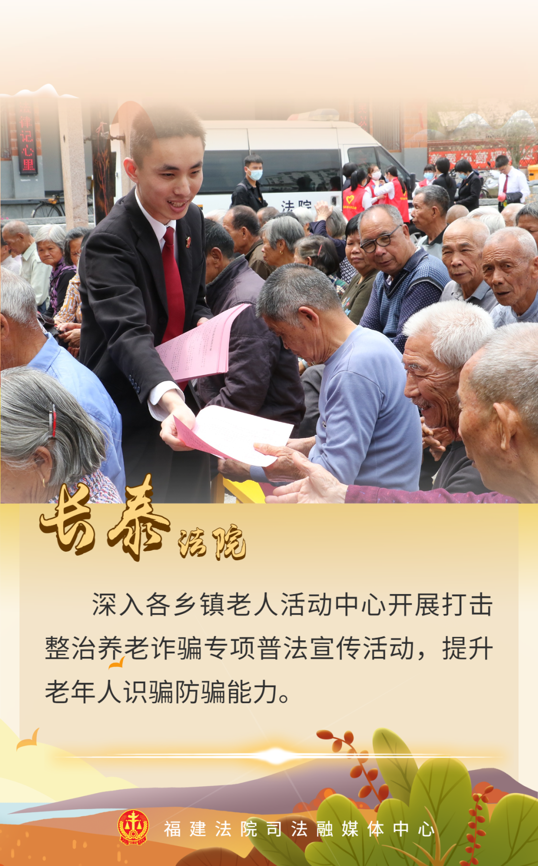打击整治养老诈骗专项行动开展以来福建法院掀起强大攻势在抓好执法办案的同时组织干警深入开展反诈宣传活动切实守好老年人的“