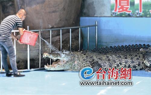 来到鳄鱼园区,一只硕大无比的鳄鱼静静地趴在地上。驯兽员拿着大水桶,把一桶水慢慢浇在鳄鱼头上。鳄鱼惬意地抬起头,还张大了嘴,承接头上流下的清凉。驯兽员一连浇了好几桶水。