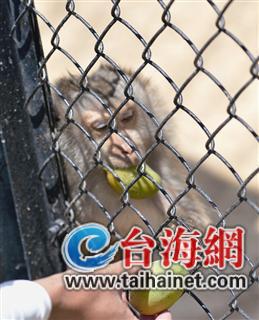 饲养员提了一袋芒果来到隔离网边上,猴群立马飞奔前来。但是,只有一只个头最大的豚尾猴在网边上接芒果,其他猴子都在边上观望,不敢靠前。小卢说,这只是“猴王”,很霸道,猴群成员都怕它。