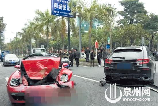 保时捷受损严重,初步估计损失达十几万元。监控视频显示,当天上午9时许,在南安普莲路,一辆红色保时捷与一辆黑色本田SUV在同向行驶时碰撞,现场车辆的零部件散落一地。其中保时捷车前的发动机罩被撞得凸起,整个车头已经被撞烂。而黑色本田SUV的车尾也不同程度受损。