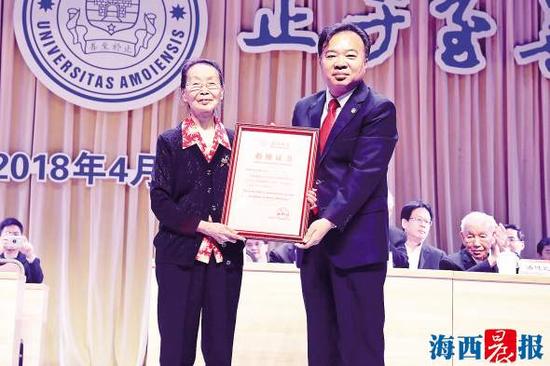 厦门网讯(海西晨报记者许蔚菡通讯员李静)又是一年厦大校庆日,又是满满校友情。在昨日的厦门大学建校97周年校庆捐赠仪式上,有一份捐赠“含金量”很重,让人特别动容:86岁高龄的徐明慧教授,拄着拐杖乘坐了16个小时的长途火车抵达厦门大学,完成丈夫———厦大校友林毅雄教授的遗愿。他们卖掉了在北京惟一的一套66平方米的学校福利房,除了徐明慧回乡定居老年公寓所需的基本养老费用外,余下的100万元尽数捐赠给了厦大生命科学学院,设立“林毅雄育人基金”,奖励、资助学生成长成才。