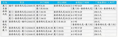 时刻表显示,广深港高铁开通运营后,厦门火车站将新增4对直通香港西九龙站的动车,其中始发终到厦门站的共有3对,即G3003/4、G3005/6、G3007/8次,由厦门站始发至香港西九龙站约需4.5小时;经停厦门北站的有1对,即G3001/2次,由厦门北至香港西九龙站不到4小时。这些列车还将分别停靠省内莆田、泉州、角美、漳州、漳浦、诏安、云霄站。