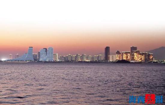 厦门网讯 (海西晨报记者 张玲玲 唐光峰) 昨日下午5点15分,海湾公园对面的海沧区高层建筑外景灯陆续点亮,“厦门腾飞相逢是首歌厦门欢迎您”等“金鸡”主题文图滚动播放,市民纷纷拍照留念。