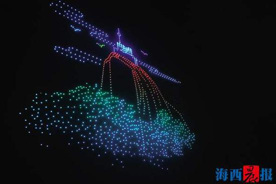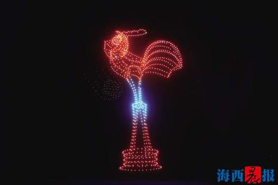 “我爱厦门”、“金鸡”、“鼓浪屿”……1200架无人机在空中变换出各种造型,引来观众喝彩。记者 唐光峰 摄
