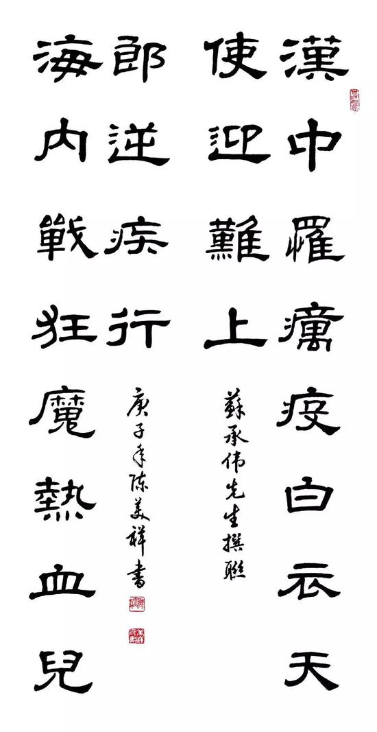 释文:汉中罹疠疫,白衣天使迎难上;海内战狂魔,热血儿郎逆疾行。