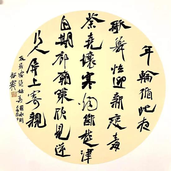 释文:《己亥除夕》 年轮循此夜,歌舞怯迎新。疫毒荼尧壤,寒烟断楚津。自期廊庙策,欣见逆行人。屏上寄亲友,居安待好春。