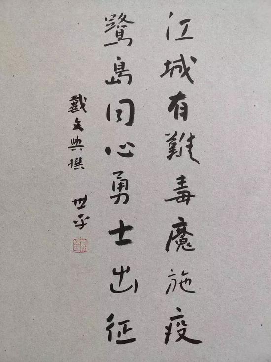 释文:以钢铁之躯,仁爱之心,奔赴疫区除病症;尽英雄者义,人民者责,勇伸妙手济苍生。