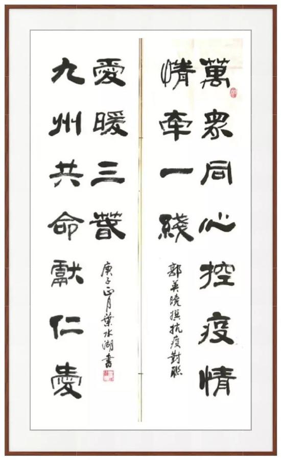 释文:万众同心控疫情,情牵一线;九州共命献仁爱,爱暖三春。