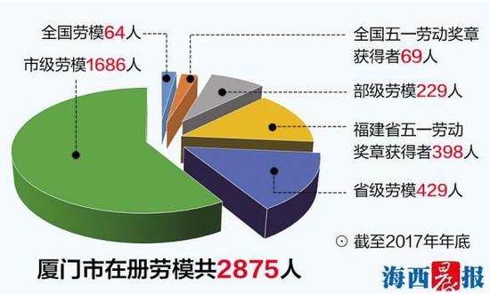 记者获悉,截至2017年年底,厦门市在册劳模共2875人。其中,全国劳模64人、全国“五一劳动奖章”获得者69人、部级劳模229人、福 建省“五一劳动奖章”获得者398人、省级劳模429人、市级劳模1686人。获评劳模中,男性为2108人,女性为767人。