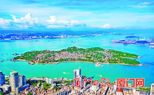 2020年,我市空气质量全年优良率达99.7%。图为碧海蓝天映衬下的鼓浪屿。(记者黄嵘摄)