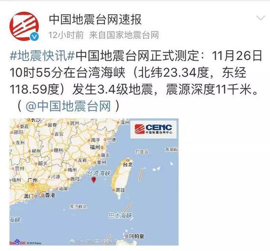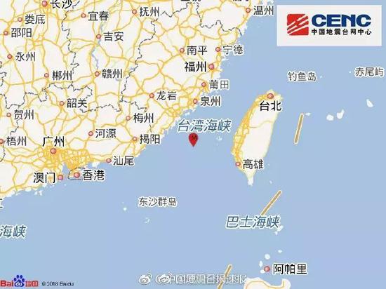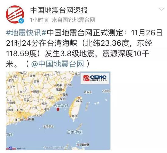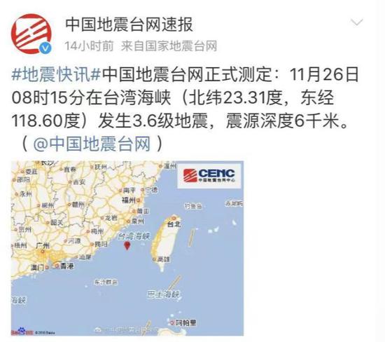 中国地震台网正式测定:11月27日06时06分在台湾海峡(北纬23.37度,东经118.61度)发生3.6级地震,震源深度14千米。