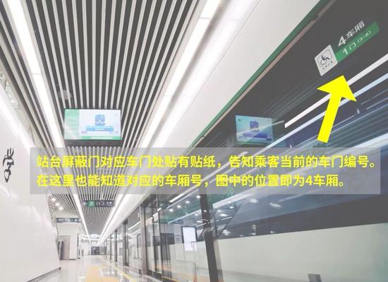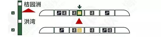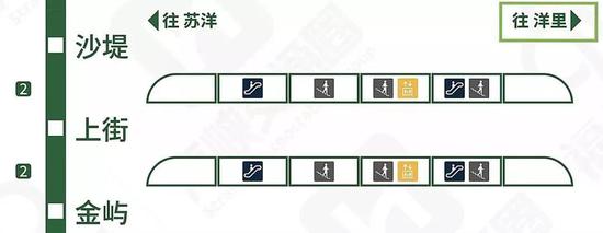 2找到对应车厢然后,我们在图上找到自己需要前往的站点,每个站点下面对应着6节车厢,每节车厢上分别有不同的图标,对应不同设施(电扶梯、垂直电梯等),找到所需设施,就代表这节车厢是离这个设施最近的车厢。
