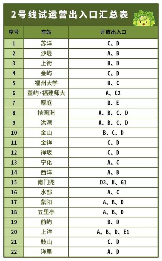 试运营初期,2号线部分站点的出入口还未全部开放,小编为大家整理了全线开通出入口汇总表,请大家从各站点相应出入口进站。