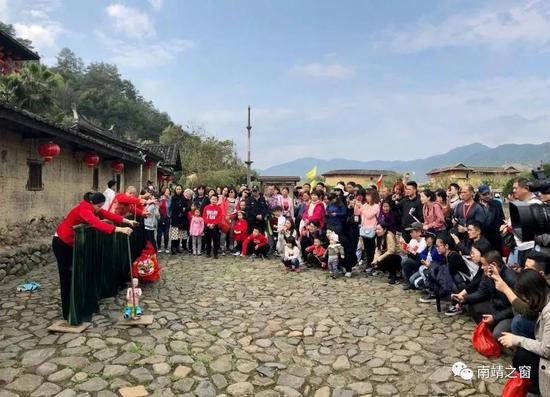 采风团在田螺坑土楼群观景台前拍照 采风团来到和贵楼前欣赏提线木偶表演英国三大报之一的《卫报》3月20日最佳图片为一幅漳州南靖民俗文化图片,图片说明为“土楼外,父亲抱着孩子与一排木偶比邻而坐。土楼建在稻田、茶园和烟草田之间,有些可追溯至公元12世纪”。