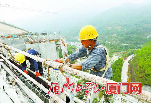在坝顶作业面,上百名工人在为最后阶段的混凝土浇筑做准备。 本报记者到枋洋水利枢纽工程现场采访。早春时节,层峦叠嶂的漳州长泰枋洋,在雾气中萌发着浓浓的生机。正如破土而出的春笋一般,枋洋水利枢纽工程的核心部分——上存水库大坝也正在不断地“长个子”。记者来到工地现场时,正赶上大坝工程最后的冲刺——大坝已经浇筑至88米多高,攻克最后1米高度就将全面封顶,预计今年8月底将具备下闸蓄水条件。