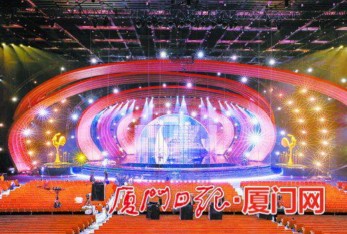 昨晚,工作人员在厦门海峡大剧院调试灯光系统。今晚,第28届中国金鸡百花电影节闭幕式将在此举行。(本报记者 王火炎 摄)