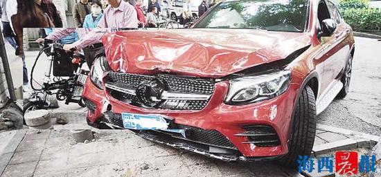 厦门一奔驰车撞破石墩冲上人行道 撞伤卖早餐摊主