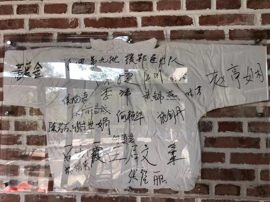 张永祥把签有19名医护工作者姓名的防护服挂在了农场办公室。