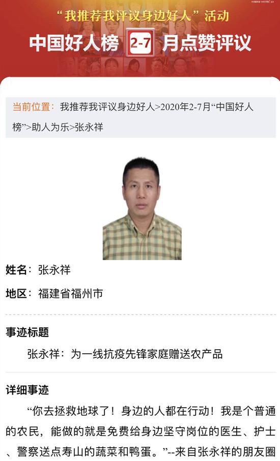 近日,中国文明网主办的“我推荐我评议身边好人”活动中,福州农民张永祥作为福建省代表之一,被提名2—7月的“中国好人”。张永祥获“中国好人”提名。