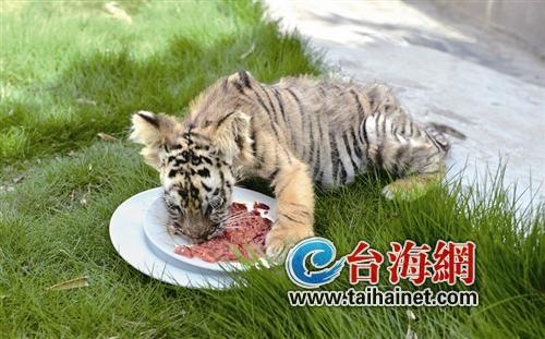昨天上午,导报记者来到位于翔安的厦门中非世野野生动物园。动物园老板周总带导报记者来到暂时存放小虎仔的马来闭壳龟园区。工作人员小卢端着一盘新鲜牛肉,正准备给小老虎“开饭”。小卢说,这盘牛肉足足半斤,还加了鸡蛋、动物奶粉、钙粉、多种维生素等。这是小虎仔的早饭,下午还有一顿同样的晚饭。小卢把盘子放在草地上,小老虎扑上去,一阵狼吞虎咽,约30秒就吃完了。