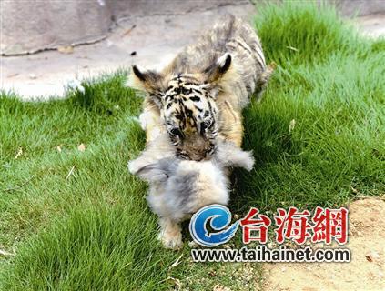 4月27日,厦门中非世野野生动物园喜得两只东北虎雄性虎仔,这是动物园去年从海沧搬迁到翔安以后的最大喜讯,动物园全员欢呼。可是,小老虎出生才5天,“虎妈妈”就因烦躁而弃养小虎,不再给小虎哺乳。动物园连忙采用人工喂养,并找来一只“狗奶妈”喂养。经过3个月的精心照料,如今小虎仔已经度过哺乳期,开始吃肉,个头也疯长起来。今天小虎仔正好满3个月,昨天导报记者在动物园看到,小虎仔现在已经能够奔跑自如,抓捕兔子也是有模有样。