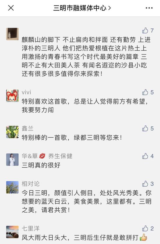 “我大福建真是处处美得没话说!”“哈哈,我大沙县又压轴了。”“太好听了!内心充满自豪!”“开门见绿,抬头见蓝,这就是我的家乡。”还有网友希望这首歌“能上春晚”。更有网友吟诵起三明,“好山好水好风情,数一数二数三明。红军长征出发地,客家文化传世界 ……”
