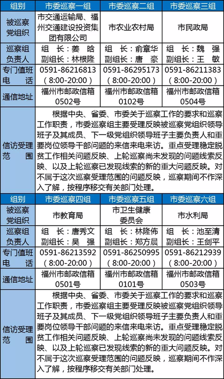 台海网2月15日讯 据清风福州报道,根据《中国共产党党内监督条例》、《中国共产党巡视工作条例》、中央办公厅《关于市县党委建立巡察制度的意见》、省委办公厅《关于建立市县党委巡察制度的实施意见》、福州市委《关于进一步落实市县党委巡察制度的意见》及省委、市委关于巡察工作的部署要求,经市委同意,市委巡察工作领导小组决定,从2月中旬开始,市委6个巡察组分别对市教育局、市民政局、市水利局、市农业农村局、市卫生健康委员会、市交通运输局、福州交通建设投资集团有限公司等7家单位开展稳定脱贫专项巡察暨巡察“回头看”工作,巡察时间22天。