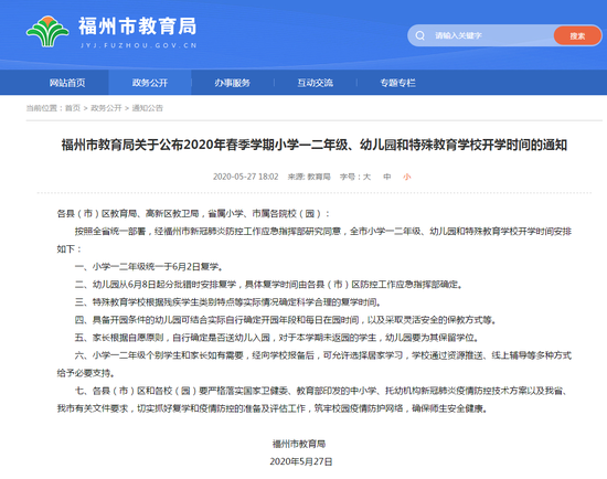 按照全省统一部署,经福州市新冠肺炎防控工作应急指挥部研究同意,全市小学一二年级、幼儿园和特殊教育学校开学时间安排如下: