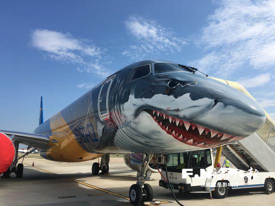 福州新闻网8月3日讯(福州日报记者 朱榕)3日上午,鲨鱼涂装的E190-E2支线客机亮相福州机场,咧开的大嘴露出锋利的獠牙,霸气外露。这是国内首架E190-E2支线客机,也是福航首架支线客机。专业人士分析,福航引进支线客机,意在开发经营支线航空市场,将目光转向二线和三线城市。