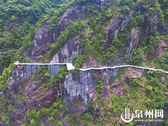 德化岱仙瀑布悬崖栈道工程,是省重点项目石牛山旅游度假区一期景点之一。整条栈道盘山而上、曲折险峻,设计总长约3000米,宽度2米。目前,该工程进展顺利,已完成2300米栈道、20座观景台和1座桥梁的混凝土浇筑施工,主体工程有望于今年7月完成。