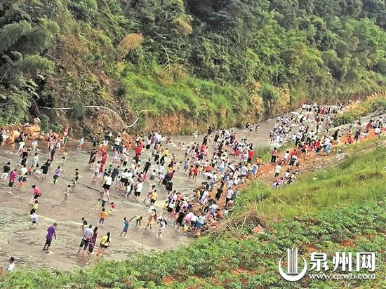 大约在一周前,德化县盖德镇县道346附近一片河床突然在网上走红,被当地人称为小“白水洋”。从网传视频上可见,溪水缓缓流过窄窄的河床,数百名大人小孩在河床上戏水、纳凉,而河床一侧,则是一片黄土坡,坡上杂草丛生,清晰可见许多石头。