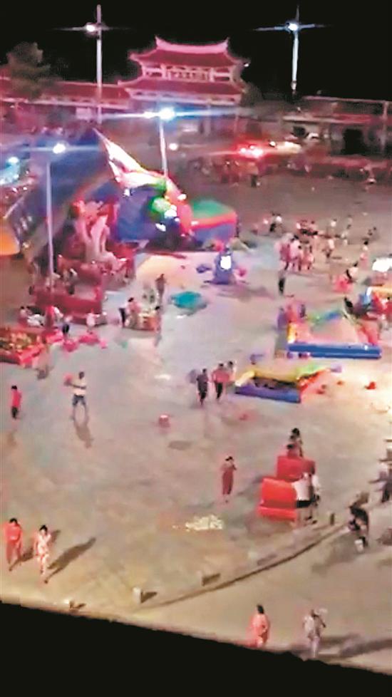 泉州网5月30日讯(记者陈明华)昨日晚上8点多,泉港镇峰尾镇金秋阳光海岸突然刮起大风,广场上一个充气城堡被掀翻,导致城堡内多名大人小孩受伤。事发后,当地民警、消防、120赶到现场救援。目前已经确认有一名小孩遇难。