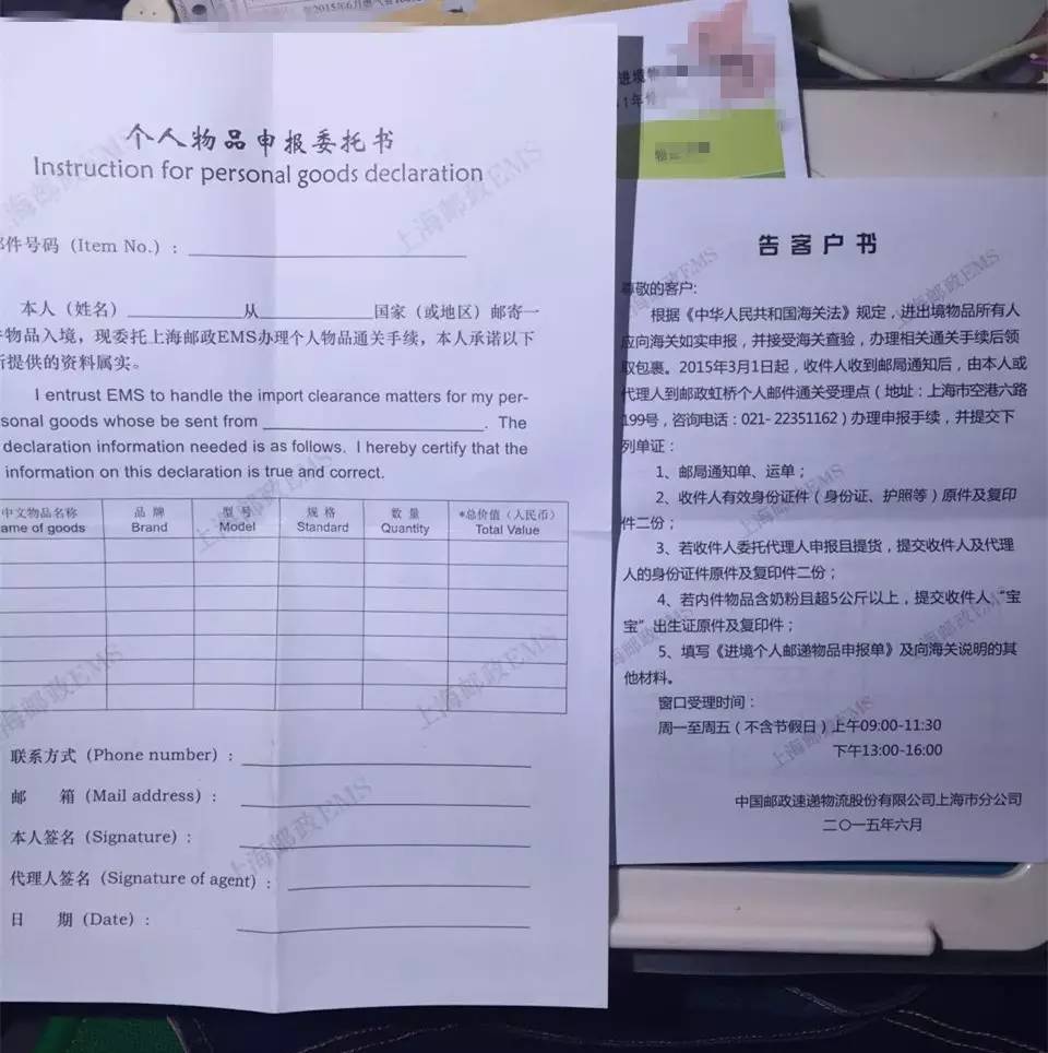 先说说 正常报税 ,需填写申报委托书 带上个人身份证明以及邮包单号到海关交税,如下图。