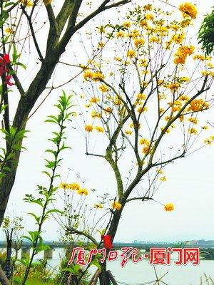 漳州台商投资区投入4000多万元,从去年开始整治九龙江厦门取水口附近北岸的差乱,并沿江岸修整一条占地20多亩的生态带,种草坪、栽花木,保护厦门饮用水源。近日,该生态带草绿花开,成为一道飘香的景观。