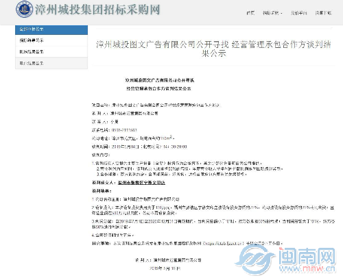 闽南网记者梳理发现,早在5月16日,漳州城投集团招标采购网就发布了一则招标公示。该公示显示,谈判人为漳州城市运营集团有限公司(下称“城市运营集团”),而谈判成交人为福州市鼓楼区宁静文印店。根据谈判结果,城市运营集团成立图文广告公司,注册名称为漳州城投宁静图文广告有限公司。本次设备投资费用大于130万,谈判人投资总额25%,谈判成交人投资总额75%共同出资。此外,自2019年7月1日至2020年12月21日有效期内,当利润总额小于0时,双方各承担50%的亏损;当利润总额大于0时,双方各按50%进行利润分配。合同签订期限为五年。