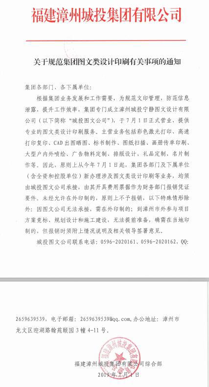 漳州城投集团下发通知,要求集团各部门及下属单位的文印业务到指定公司办理