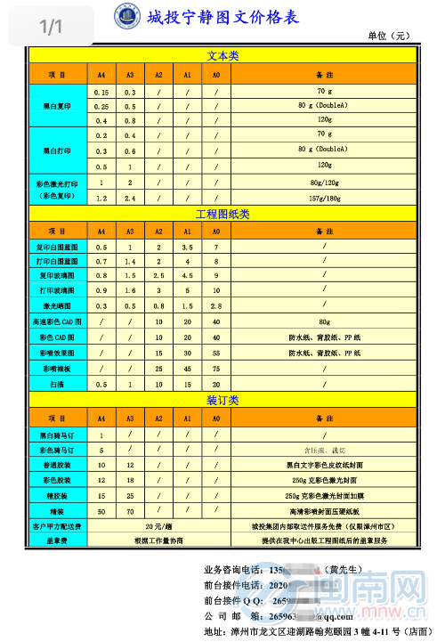 7月11日下午,闽南网(www.mnw.cn)记者来到位于龙文区迎湖路的城投宁静图文中心。据一位自称是负责人的黄姓工作人员介绍,该中心就是漳州城投集团新成立的图文公司。他介绍,中心主要负责对接城投集团的相关晒图文印业务,目前还未对市场开放。而当闽南网记者咨询晒图文印业务价格时,该工作人员则称“已在漳州城投集团内部公布”。随后,闽南网记者通过有关渠道拿到了该中心晒图文印业务价格表。